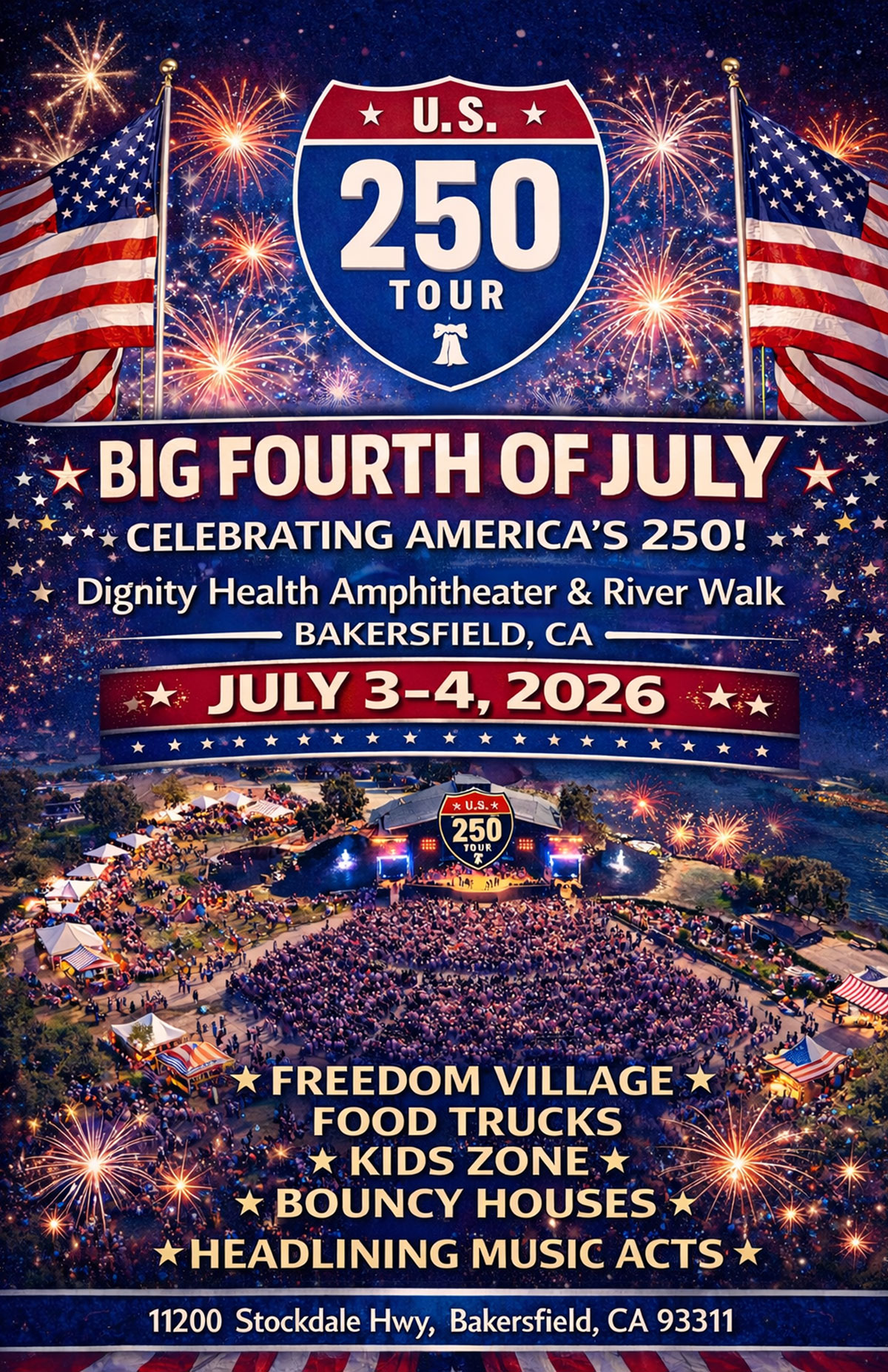 The U.S. 250 Tour is coming to Bakersfield, California on July 3-4, and you are invited to a massive two-day celebration of heritage and harmony! Don’t miss this historic nationwide journey toward America’s 250th Anniversary, offering an immersive experience filled with patriotic pride, family fun, and incredible live music. The two-day celebration is one of the stops of this historic nationwide tour during the United States Semiquincentennial.