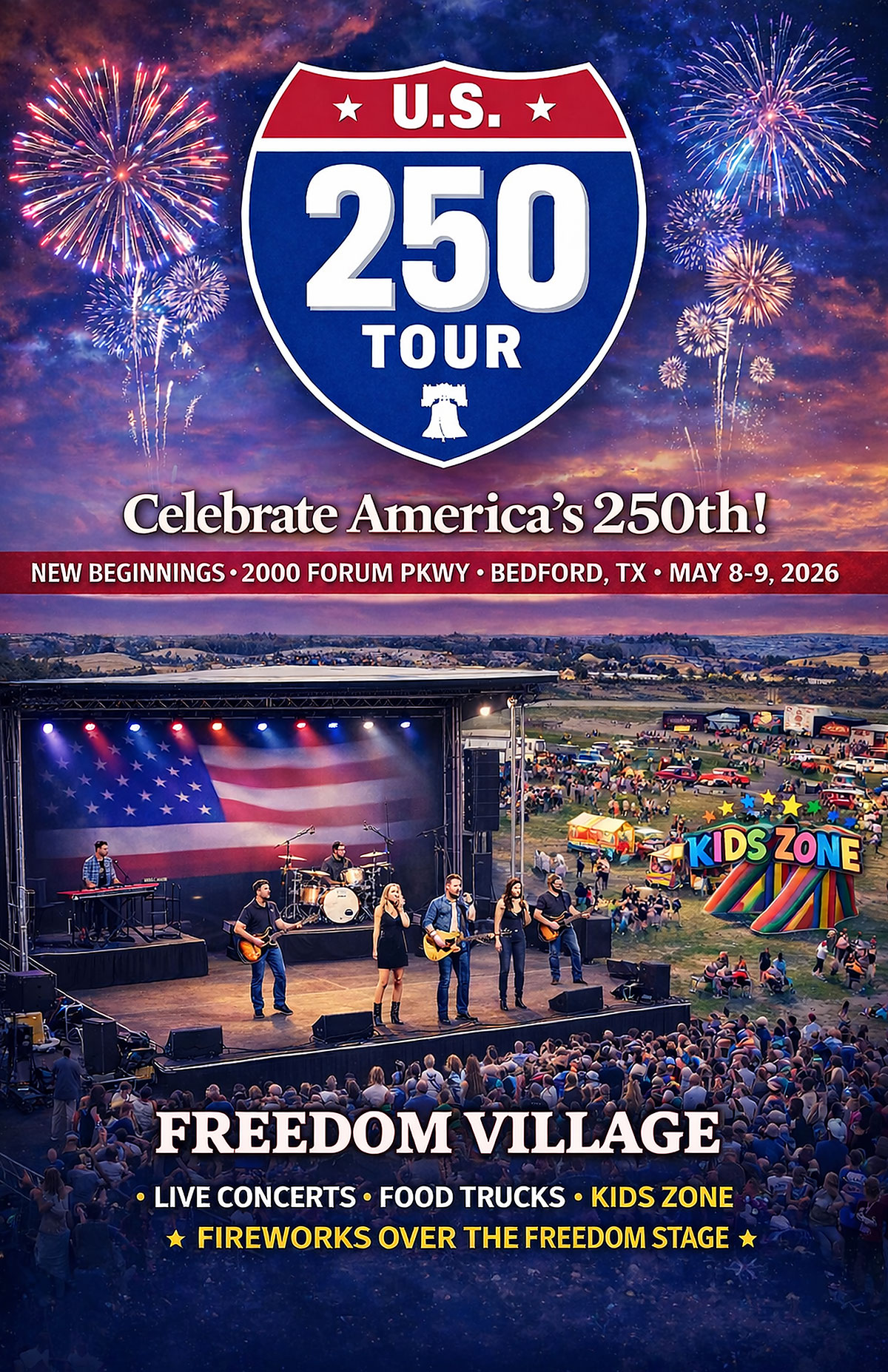 The U.S. 250 Tour is coming to Bedford, Texas (in the Dallas area) on May 8-9, and you are invited to a massive two-day celebration of heritage and harmony! Don’t miss this historic nationwide journey toward America’s 250th Anniversary, offering an immersive experience filled with patriotic pride, family fun, and incredible live music. The two-day celebration is one of the stops of this historic nationwide tour during the United States Semiquincentennial.